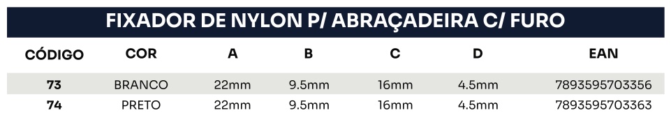 Garanta uma fixação robusta e de alta confiabilidade. Este fixador com furo é projetado para ser preso com parafuso, sendo a escolha ideal para a organização de cabos, tubos e canaletas que exigem maior segurança. Fabricado em Poliamida 66,94V-2 com certificação UL, possui resistência ao calor e proteção UV.